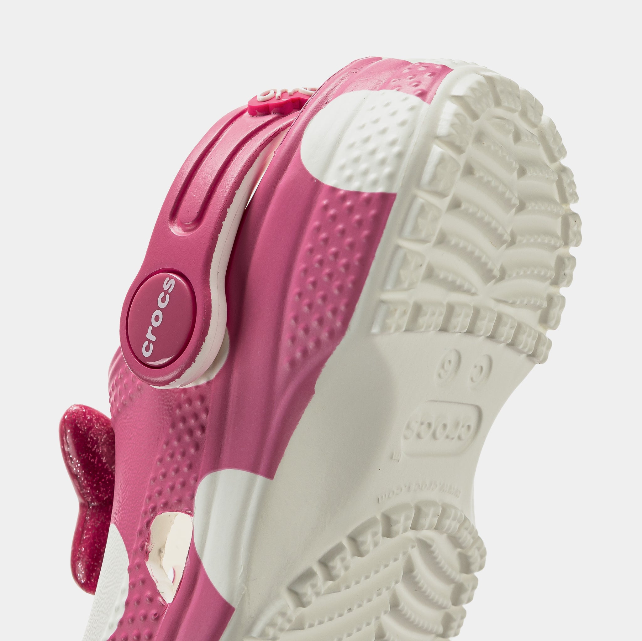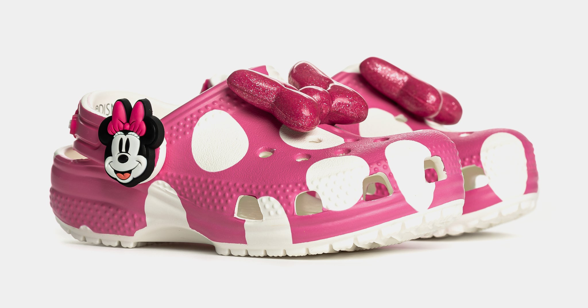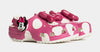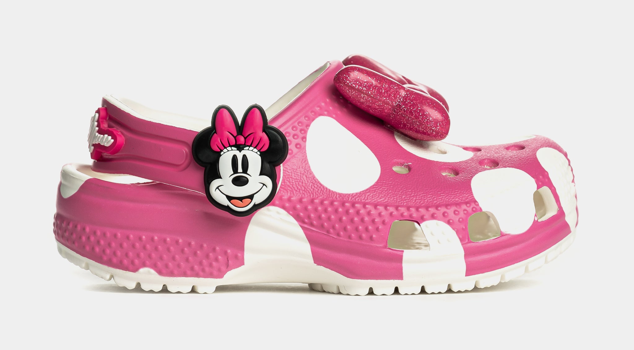 Yoo-hoo, it’s the Minnie Mouse Classic Clog from the Disney’s Mickey & Friends collection! This adorable Classic Clog is designed with Minnie Mouse’s iconic style in mind, featuring a pink polka dot print topped with a big, pink, glitter bow on each shoe! Minnie Mouse’s face adorn each of the rivets with her signature across the backstrap.