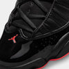 This offering of the Jordan 6 Rings features an all-Black base constructed in a mix of mesh, leather, and patent leather mudguards. A chenille-like branded tongue with Infrared contrasting accents throughout atop a Black midsole completes the design.