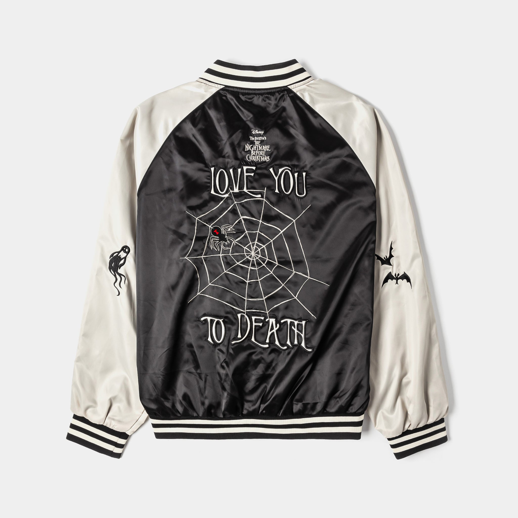 Show your spooky style with The Nightmare Before Christmas Love You To Death Satin Jacket by Shoe Palace. Featuring bold graphics of Disney’s Jack Skellington and Sally, this sleek satin jacket blends Tim Burton’s iconic characters with streetwear-ready design. Lightweight yet durable, it’s perfect for layering over tees and hoodies, making it a standout piece for everyday wear or seasonal festivities.