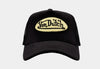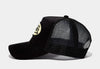 This Classic Snapback Trucker Hat by Von Dutch features black velvet with the iconic logo patch on front, black breathable mesh rear, and an adjustable snapback panel.